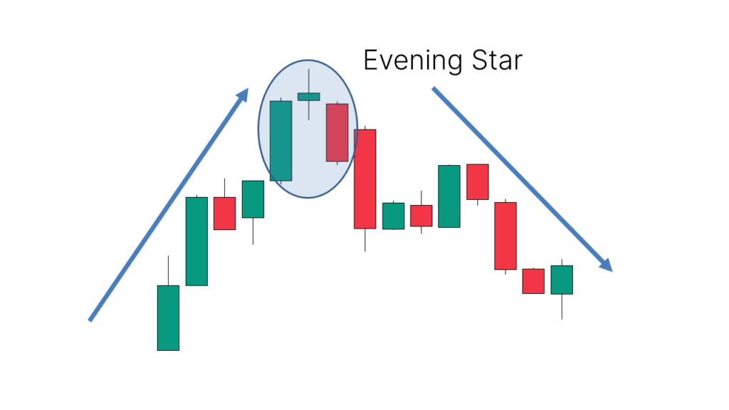 In summary, the Evening Star candlestick pattern is a reliable bearish reversal signal when it appears at the top of an uptrend. It consists of three candles: a long bullish candle, followed by a small-bodied “star” candle, and a long bearish candle that confirms the reversal. As with all technical patterns, it’s crucial to use the Evening Star in conjunction with other indicators to confirm its validity and avoid false signals.