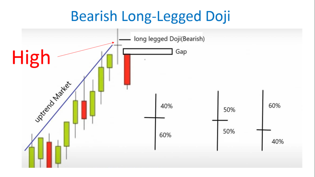 • The Long-Legged Doji has longer shadows and indicates a greater level of price movement during the period, showing that the market experienced significant volatility before closing at or near the open price.